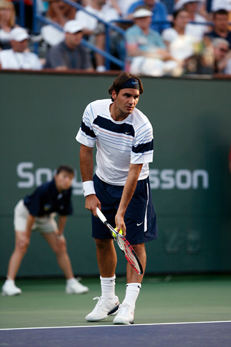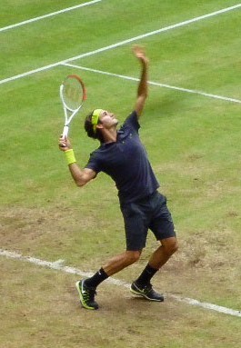In der Ausgangsstellung befindet sich der Aufschläger in etwa 15 – 50 cm links oder rechts von der Mitte der Grundlinie. Um eine stabile Ausgangsstellung zu gewährleisten sind die Füße etwa schulterbreit auseinander gestellt (DTB, 2001, S. 104). Beide Füße berühren die Grundlinie nicht und die linke Fußspitze zeigt ungefähr zum rechten Netzpfosten, der rechte Fuß steht parallel zur Grundlinie (Scholl, 2009, S. 73). Das Gewicht ist zunächst gleichmäßig auf beide Füßen verteilt, die linke Schulter sowie die Schlägerspitze zeigen in Schlagrichtung (Scholl, 2009, S. 73).