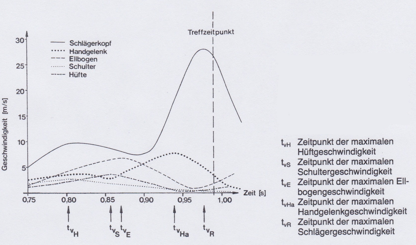 Abb. 4. Geschwindigkeits-Zeit-Verlauf von Hüfte, Schulter, Ellbogen, Handgelenk und Schlägerkopf (Menzel, 1992, S. 120)