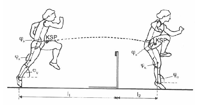 In den Längen L1 und L2 lässt sich die Bewegung des Athleten, bzw. der jeweilige Abstand zur Hüde, und somit auch die des KSP in horizontaler Richtung ablesen. Dieser Abstand von 2/3 vor- und 1/3 nach der Hürde, ermöglicht dem Athleten eine optimale Überquerung der Hüde.