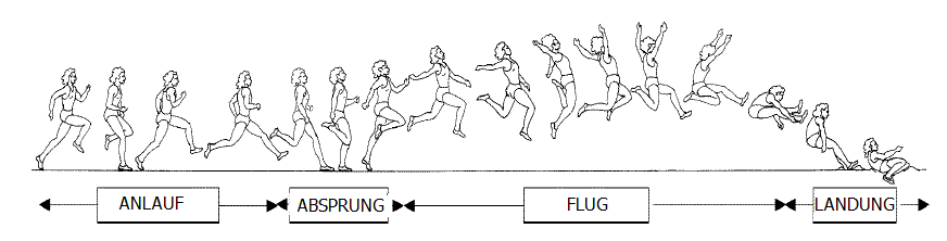 Der Weitsprung lässt sich in die vier Phasen Anlauf, Absprung, Flug und Landung gliedern.