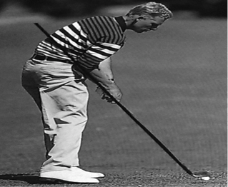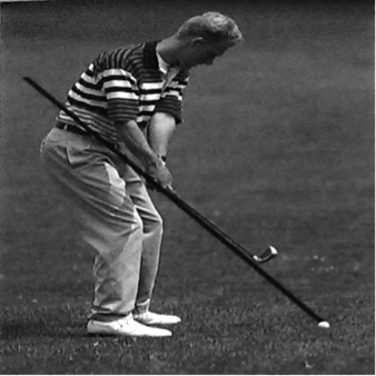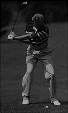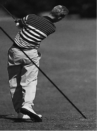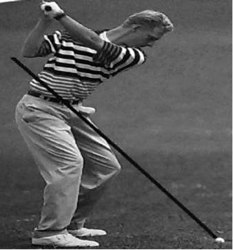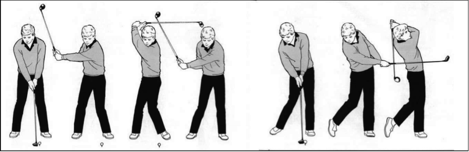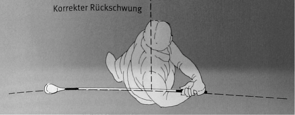 Beim Zurückführen des Schlägers ist besonders darauf zu achten, dass dieser einen imaginären Kreisbogen durchläuft, auf dessen Bahn auch der Ball liegt (siehe Abb. 7). Die Wirbelsäule des Golfers bildet hierbei den Kreismittelpunkt. Der Rückschwung wird durch eine Bewegung der Hände, Schultern, Arme und zum Teil auch der Hüfte ausgeführt, wobei die Arme die Y-Haltung der Grundposition nicht verlassen. Sobald der Schläger einen 90° Winkel zum Boden einnimmt, muss er sich genau parallel über der imaginären Gerade befinden, die von den beiden Fußspitzen am Boden eingenommen wird. Das Gewicht befindet sich während der kompletten Phase des Rückschwungs auf dem rechten Bein (Heuler, 1994, S. 74f.).