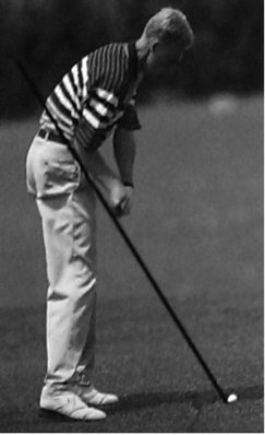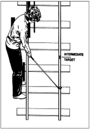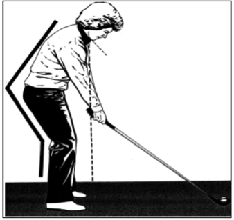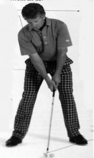 Der Ball sollte etwa mittig zwischen der schulterbreiten Fußstellung liegen und soweit vom Körper entfernt sein, dass die oben beschriebene Idealhaltung problemlos eingenommen werden kann. Die beiden Fußspitzen bilden dabei eine imaginäre Linie. Der Ball befindet sich auf einer zweiten Linie, welche zur Linie der Fußspitzen parallel ist und die Gerade durch Ball und Ziel bildet (siehe Abb. 4). Der Golfer selbst befindet sich also sozusagen seitlich vom Loch. Das Schlagblatt wird in einem 90°-Winkel zur Geraden Ball-Ziel ausgerichtet. Zur bildlichen Verdeutlichung kann sich auch eine Eisenbahntrasse vorgestellt werden, bei der sich die Fußspitzen des Golfers auf der ersten und der Ball auf der zweiten der beiden Schienen befindet (siehe Abb. 5) (Ballingall, 1993, S. 29&50).