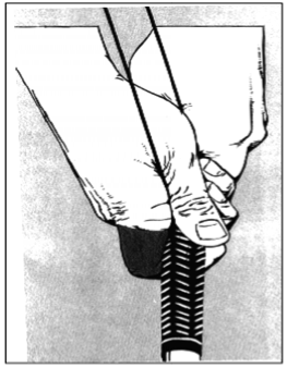 Trotz der verschiedensten in der Fachliteratur anerkannten Griffarten, lassen sich einige Gemeinsamkeiten finden, die grundsätzlich Allgemeingültigkeit beanspruchen. Der Griff des Schlägers sollte weder zu hoch auf dem Handballen, noch zu tief auf den Fingergelenken ruhen. Bei Rechtshändern greift die linke Hand nahe dem Griffende, die rechte Hand darunter, also näher zum Schlägerblatt. Der linke Daumen ist unter der rechten Hand fast vollständig verborgen. Zudem sollte der Griff locker sein. In dieser Grundposition sind die Handgelenke gerade und befinden sich in der Verlängerung des Schlägers (Ballingall, 1993, S. 26).