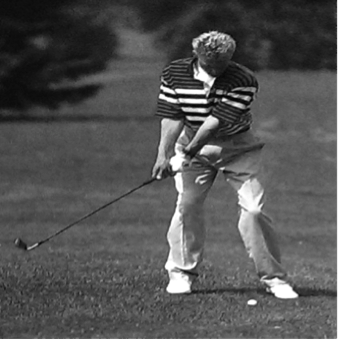 Nachdem der Top of the Swing erreicht wurde, wird nun vom Rückschwung in den Abschwung übergegangen. Dabei bewegen sich beim Rechtshänder die linke Hüfte, sowie das linke Knie in Richtung des Ziels. Durch die Bewegung der Knie und der Hüfte nach links, wird auch der aufgedrehte Oberkörper zurückgedreht. Durch ein gleichzeitiges nach unten Führen der Hände wird der Abstand zwischen rechter Schulter und den Handgelenken fortlaufend vergrößert (siehe Abb. 15), da die Zentrifugalkraft die Hände nach außen tragen. Während des Abschwungs, verlagert sich das Gewicht kontinuierlich vom rechten auf das linke Bein, also noch bevor der Ball berührt wird (Heuler, 1994, S. 88).