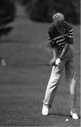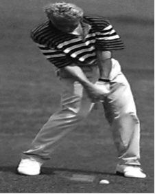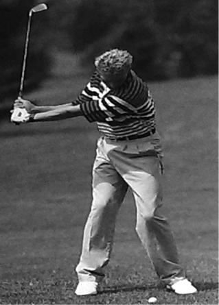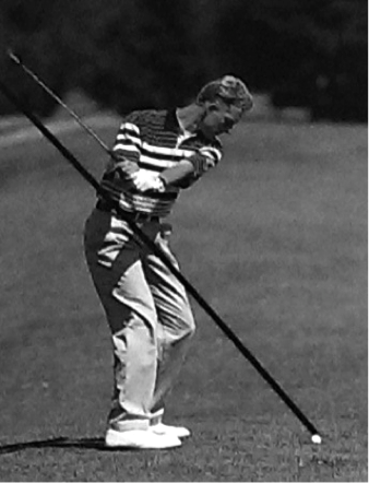Zu diesem Zeitpunkt sind beide Arme nahezu gestreckt (siehe Abb. 19). Der linke Oberarm befindet sich mit dem Schlägerschaft auf ein und derselben Linie, ebenso wie das linke Handgelenk und der Unterarm. Der Winkel zwischen Schlägerschaft und linkem Handgelenk hat sich also erst jetzt komplett aufgelöst. Der Schläger befindet sich wieder komplett auf der schon im Rückschwung begangenen Kreisbahn (siehe Abb. 18) (Heuler, 1994, S. 93).