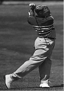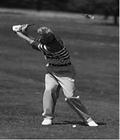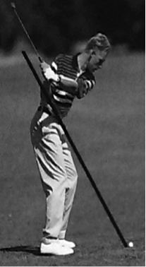 Die folgende Position, auch "top of the swing" (Lewis, 1993, S. 56) genannt, stellt den letzten Phasenabschnitt der Ausholbewegung dar. Durch das Eindrehen des Oberkörpers und im Vergleich geringer Rotation in der Hüfte wird eine hohe Körperspannung aufgebaut, die später ein kraftvolles Vorschwingen des Schlägers ermöglicht. Am Umkehrpunkt zwischen Rück- und Vorschwung soll der Winkel zwischen Arm und Schlägerschaft bei etwa 90° liegen. Während der Phase des "top of the swing" (ebd., S. 56) befindet sich der Schläger parallel zur Ball-Ziel-Geraden (siehe Abb. 11), da sonst die Gefahr eines Hook oder Slice, also ein Verziehen des Balles, relativ groß ist. Um die Position einnehmen zu können, wird der rechte Ellbogen nun noch mehr angewinkelt (siehe Abb. 12), wohingegen der linke Arm weitestgehend gestreckt bleibt (Heuler, 1994, S. 78f.).