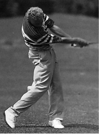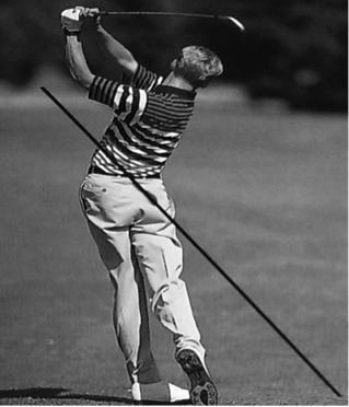 In der letzten Phase des vollen Schwungs wird die kinetische Energie des Schlägers und der Hände kontinuierlich bis auf 0 reduziert. Dabei wird der Oberkörper weiter so gedreht, dass die rechte Schulter näher zum Ziel gerichtet ist, als die linke (siehe Abb. 22). Wegen dieser Körperdrehung berührt vom rechten Bein nur noch die Fußspitze den Boden (siehe Abb. 23). In der Endposition befinden sich die Hände links neben dem Kopf; der Oberkörper verlässt die leicht gebeugte Grundhaltung und richtet sich auf. Das Erreichen dieser Endposition attestiert dem Golfspieler eine optimale Balance, welche für einen sauberen, gleichmäßigen Schwung unabdingbar ist (Heuler, 1994, S. 105 f.).