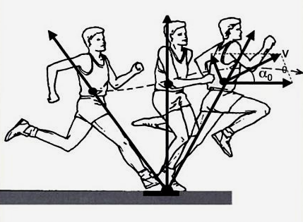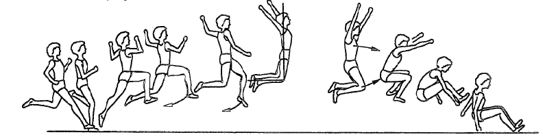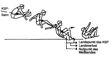 Beim Absprung wird die horizontale Anlaufgeschwindigkeit schwach abgebremst und durch die Streckung beim Absprung in eine vertikale Beschleunigung umgelenkt (siehe Abb.2). Die beim Absprung auftretende Geschwindigkeitsreduktion wird jedoch durch den nachfolgenden Beschleunigungskraftstoß verringert.