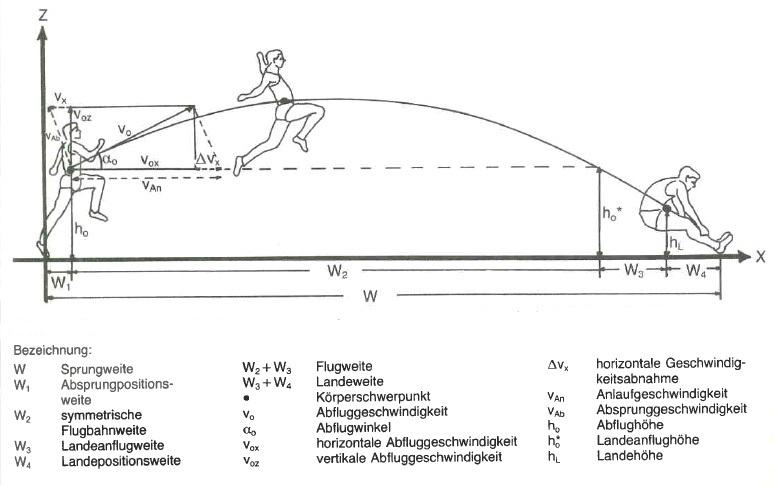 Im Folgenden werden Anlauf, Absprung, Flug und Landung beim Weitsprung in biomechanischer Betrachtungsweise näher analysiert. Besonders berücksichtigt werden hierbei die Beschleunigungsphase bis hin zum Absprung. Für eine große Gesamtsprungweite ist eine hohe Sprintgeschwindigkeit essentiell. In nachfolgender Skizze erkennt man die drei wichtigsten Faktoren für die größtmögliche Sprungweite, nämlich